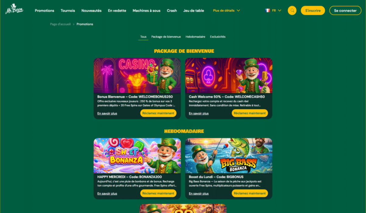 Les bonus occupent une place centrale chez Mr Baron Casino. Le site ne multiplie pas les offres inutiles, mais propose des promotions bien identifiées, chacune avec ses propres règles.